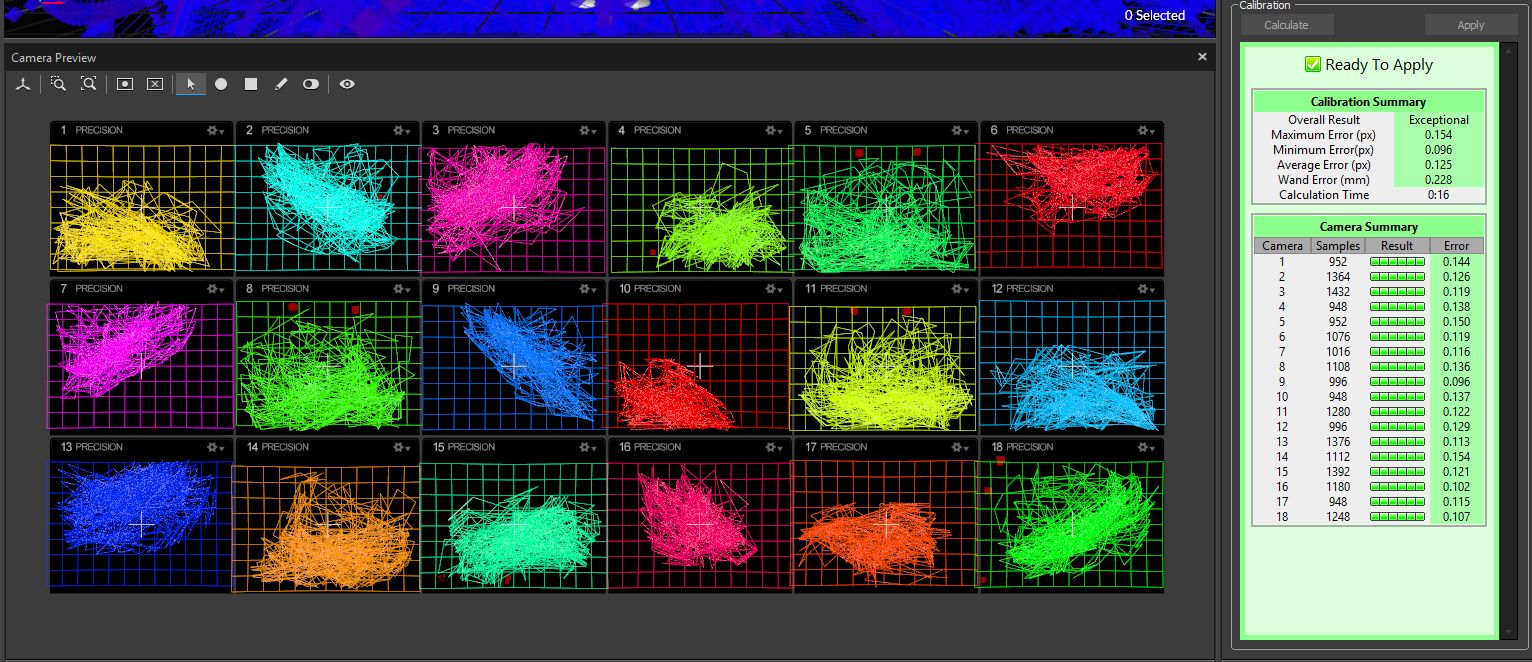 Keep on wanding util each cameras LED circle is fully green and you have reached at least 5000 samples on each camera.
