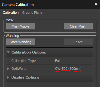 Select OptiWand CW-500 (500mm) in the Calibration pane as wand type and press Start Wanding.