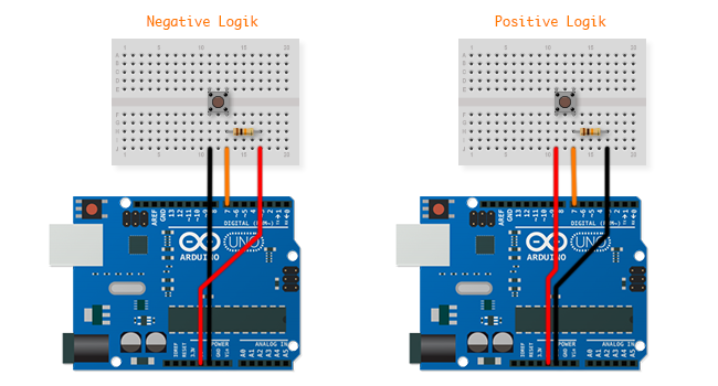 The difference between negative and positive logic lies in the fact that with a negative logic the value at the digital pin is pulled to 0V (LOW) when the button is pressed. If the button is not pressed, however, a small current flows to 5V and pulls the value on the digital pin-up (HIGH). With positive logic, it's the other way around.