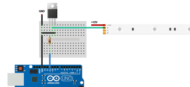 In this example, we want to light up the RGB LED strip and control its brightness. According to the labelling and datasheet, the strip needs 12V supply voltage - corresponding resistors are already present and soldered on the strip. To realize this circuit we need a 12V power supply, one transistor (TIP 122 NPN) per channel, one resistor (1kOhm) per channel and the Arduino.