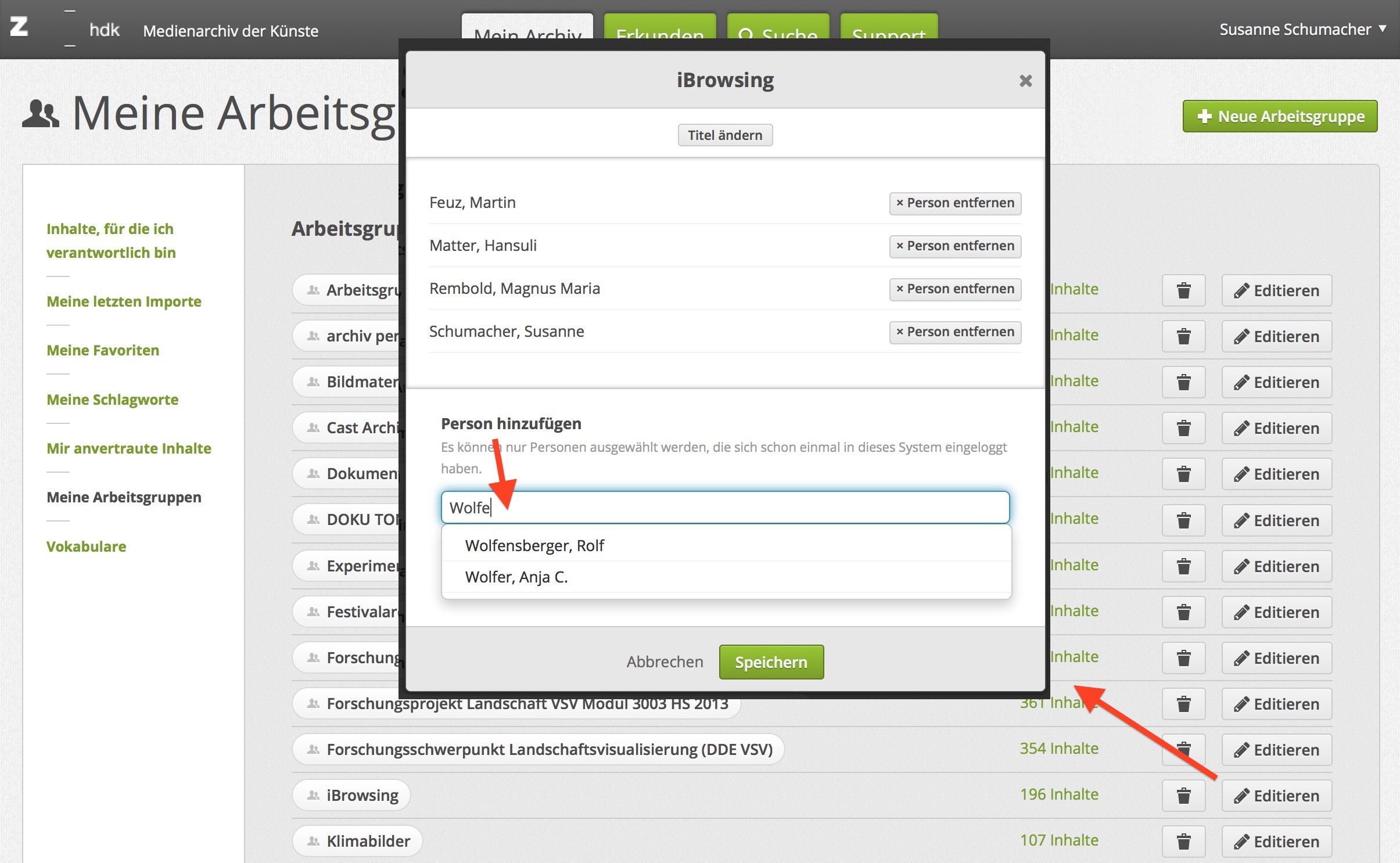 3. Durch klicken auf das Stift-Icon neben der neuangelegten Arbeitsgruppe können weitere Nutzer hinzufügt werden. Es können nur Personen einer Arbeitsgruppe zugewiesen werden, die sich zumindest einmal am Medienarchiv der Künste angemeldet haben.