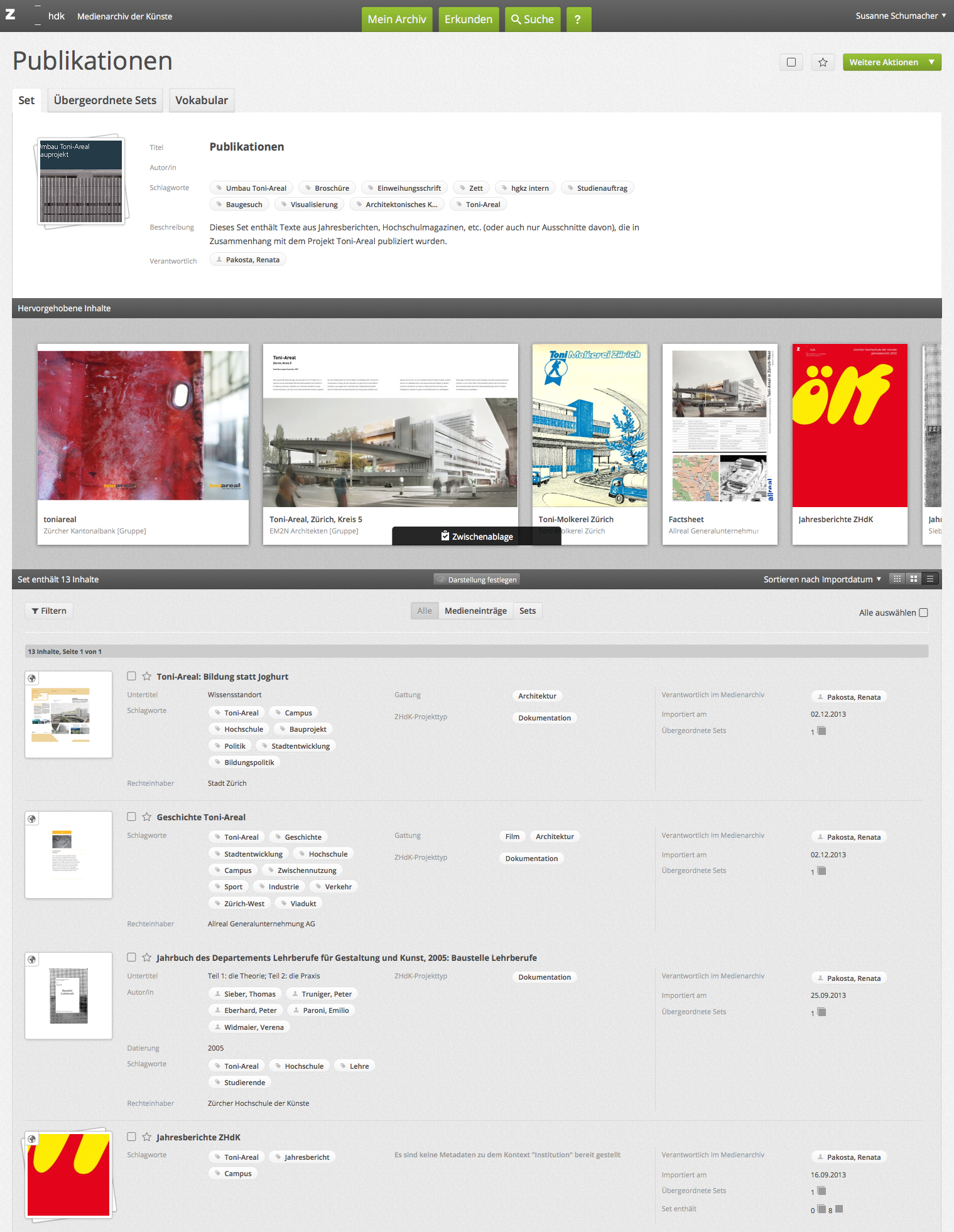 Ein Teil der Dokumentation des Projekts Toni-Areal stellen die Publikationen dar. Für dieses Set wurde die Listenansicht gewählt, da hier vor allem die Metadaten