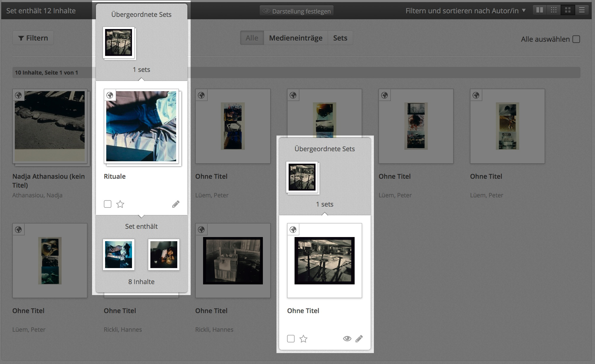 Auf den Übersichtsseiten werden in den Voransichten von Medieneinträgen und Sets angezeigt, ob sie Sets zugeordnet sind und wie vielen.
