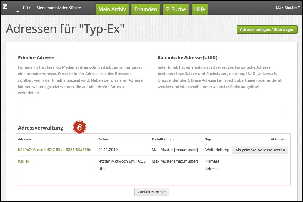 Ein Inhalt kann mehrere Adressen haben. Einmal vergebene Adressen können nicht erneut vergeben werden. Somit können Tipp-Fehler nur durch die Vergabe einer neuen Adresse korrigiert werden. Wird ein Medieneintrag oder ein Set gelöscht, verschwinden auch die mit ihm verknüpften Adressen aus dem System und können neu vergeben werden.