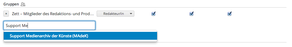 Fügen Sie im zweiten Schritt des Medienimports bei den Berechtigungen unbedingt die beiden Gruppen „Zett – Mitglieder des Redaktions- und Produktionsteam“ und „Support Medienarchiv“ hinzu und vergeben Sie für beide die umfassenden Zugriffsrechte. Dies garantiert, dass die Zett-Verantwortlichen uneingeschränkt auf Ihr Bildmaterial zugreifen können.
